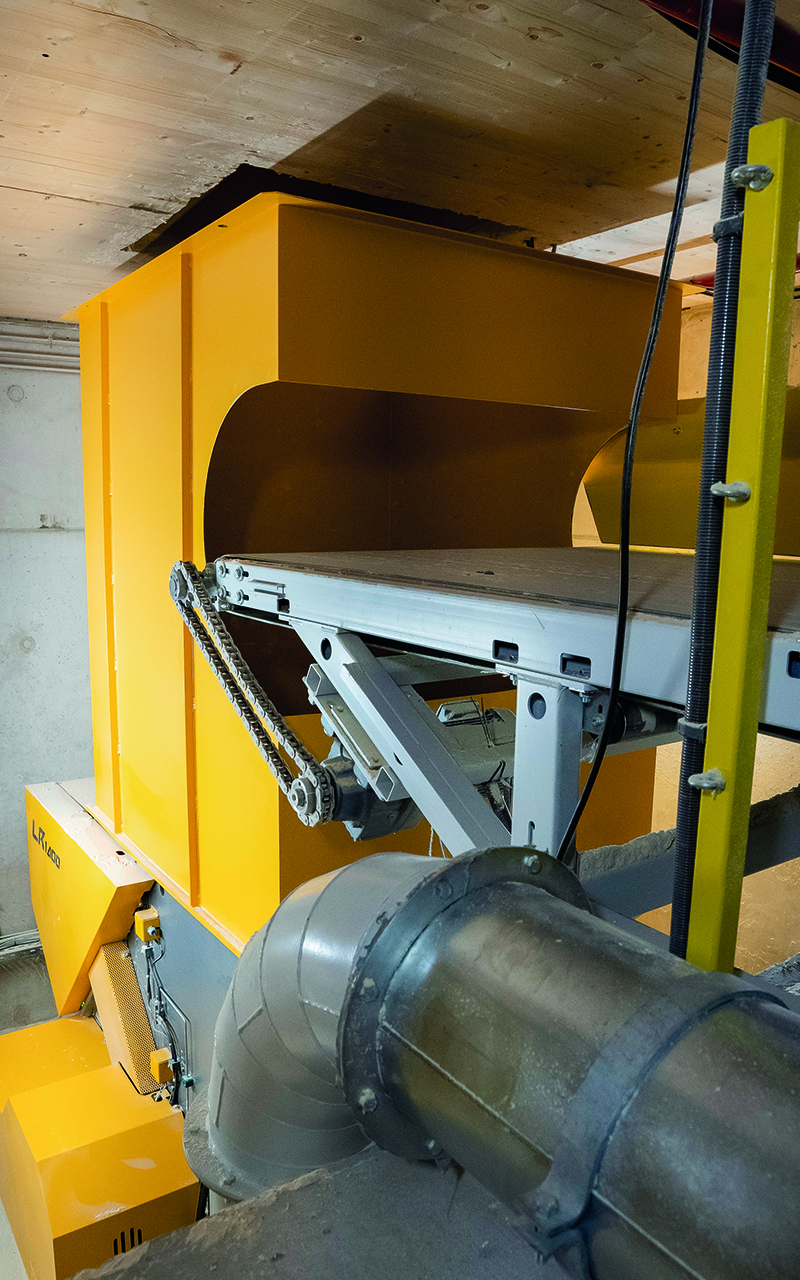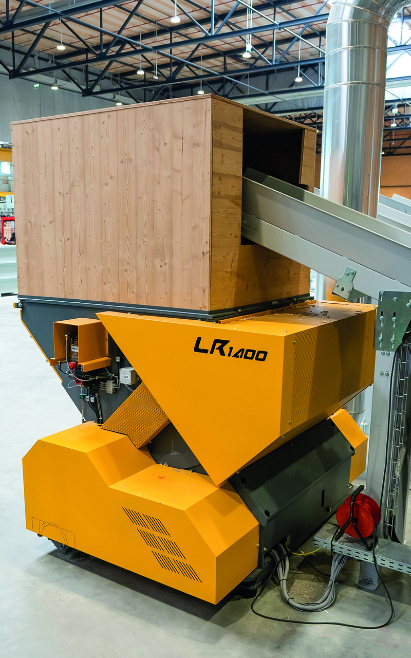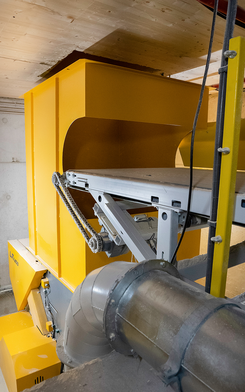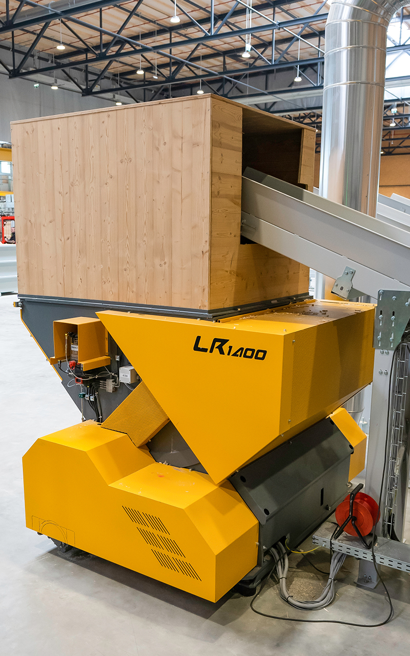 One of the shredders is positioned at the cutting unit and was fitted with a wraparound U-frame that allows for different hoppers to be fitted in a single, straightforward step. It is loaded via an inclined belt conveyor, which is started up on a fully automated basis at the command of the production machines. The second LR1400 is installed in a pit and was fitted with a modular-structure hopper with two loading levels: The first hopper is positioned at the level of the production area and is used to manually feed the shredders with large residual wood profiles, while the second hopper is located directly below. Via an under-floor conveyor belt, smaller cuts of residual wood as well as milling chips from the joinery machine are taken to the shredder, which starts up automatically when a light barrier is activated.