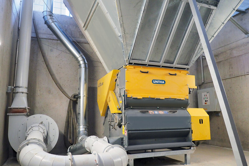 UNTHA conçoit chaque solution en fonction des exigences individuelles du client. C’est le cas de celle destinée à SPEEDMASTER, dont la technique de remplissage est peu ordinaire : les matériaux arrivent dans une grande trémie par un chariot élévateur à benne basculante surdimensionnée. Le chargement de la machine est entièrement automatique et ne doit permettre aucune formation de ponts. La vis d'évacuation est déjà installée en standard sur le LR1400 de manière à apporter les matériaux du broyeur jusqu'au point d’intersection de l’aspiration. Cela permet à l’aspiration d’avoir une puissance motrice moins importante et donc un rendement énergétique plus élevé. Comme fonctionnalité supplémentaire, l’installation entière bénéficie d’un système de graissage centralisé assisté par ordinateur, ce qui économise le graissage manuel toutes les 150 heures d’exploitation. De même, les procédures de démarrage et d’arrêt sont elles aussi automatisées. Des barrières lumineuses mesurent le niveau de remplissage : la machine démarre dès l’obtention du niveau minimum défini et s’arrête dès que l’aspiration est vide. Un régulateur a également été intégré au LR1400 pour éviter les crêtes de tension.