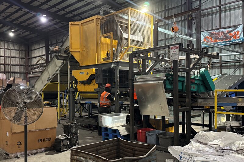 Sunnking, 2024 yılında çok çeşitli elektronik atık malzemelerini işlemek üzere tasarlanmış yüksek performanslı bir makine olan 4 şaftlı kırıcımız RS100'e yatırım yaptı. Sunnking, makineyi işleme hattına entegre etti. 75 fit uzunluğundaki bir konveyör sistemiyle çalışan kırıcı, karışık elektronik cihazları verimli bir şekilde parçalarken, televizyon ve trafo gibi özel elleçleme ve işleme gerektiren büyük boyutlu parçaların da çıkarılmasına olanak tanıyor. RS100, günde yaklaşık 30.000 pound malzemeyi kırarak iki temel çıktı fraksiyonu üretir: temiz demirli çelik ve işlenmek üzere rafinerilere gönderilen tüketici atığı.